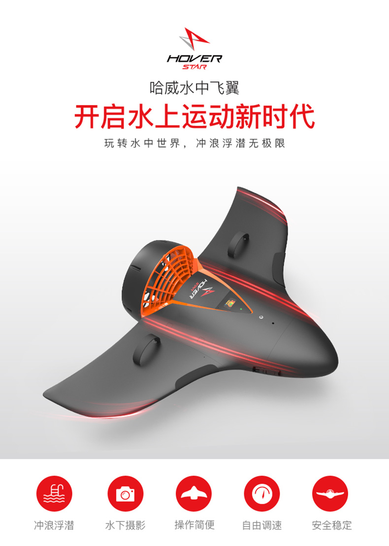 ??深潛:可搭配潛水服、呼吸管、面罩、腳蹼等潛水設(shè)備,進(jìn)行深海潛水,來一次海底世界的激情探險,和水里的群魚蝦蟹來一次親密接觸。 ??浮游:借助水中飛翼,可以輕松實現(xiàn)浮游,你可以單純的游泳,也可以短暫的潛入水中,像魚兒一樣,一會兒將頭部露出水面呼吸,一會兒潛入水里遨游前行。 ??沖浪:喜歡刺激者可以順著海浪漂流,體驗沖浪帶來的刺激感。 ??產(chǎn)品優(yōu)勢 ??功能多樣化:水中飛翼是一款集深潛、浮游和沖浪于一體的水上娛樂產(chǎn)品,滿足了人們對海洋的所有需求。 ??操作簡便:僅僅兩步就能輕松啟動:左扶手處設(shè)置有開關(guān),右扶手處設(shè)置有速度按鈕,用戶只需要左手壓下開關(guān)(保持下壓狀態(tài)),右手按下速度按鈕,即可啟動。此外,僅通過體感就可以控制方向,簡單地說,就是向左調(diào)轉(zhuǎn)水中飛翼,就可以實現(xiàn)左轉(zhuǎn);向上抬升,進(jìn)入浮游狀態(tài);向下按壓,進(jìn)入潛水狀態(tài),以此類推。 ??三檔速度:水中飛翼提供低、中、高三檔速度可供選擇,默認(rèn)速度為一檔,每按一次提升一檔,依次循環(huán)。 ??滑行穩(wěn)定:水中飛翼外形酷似去掉機(jī)尾的飛機(jī),具有平衡、穩(wěn)定和操作性強(qiáng)的特點(diǎn)。 ??水底攝影:機(jī)身正面設(shè)置有水下相機(jī)安裝位置,用戶可以根據(jù)需要安裝水下相機(jī),全程記錄水中旅程,并分享給親朋好友