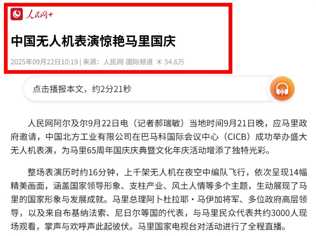 馬里政府官員表示,此次無人機表演以科技與藝術(shù)融合的獨特方式為國慶獻禮,意義深遠,令人振奮。觀眾馬馬杜·特拉奧雷激動地談到:夜空中的光影不僅展現(xiàn)了祖國的團結(jié)與希望,也讓他們更加深切地感受到中馬之間的深厚情誼。