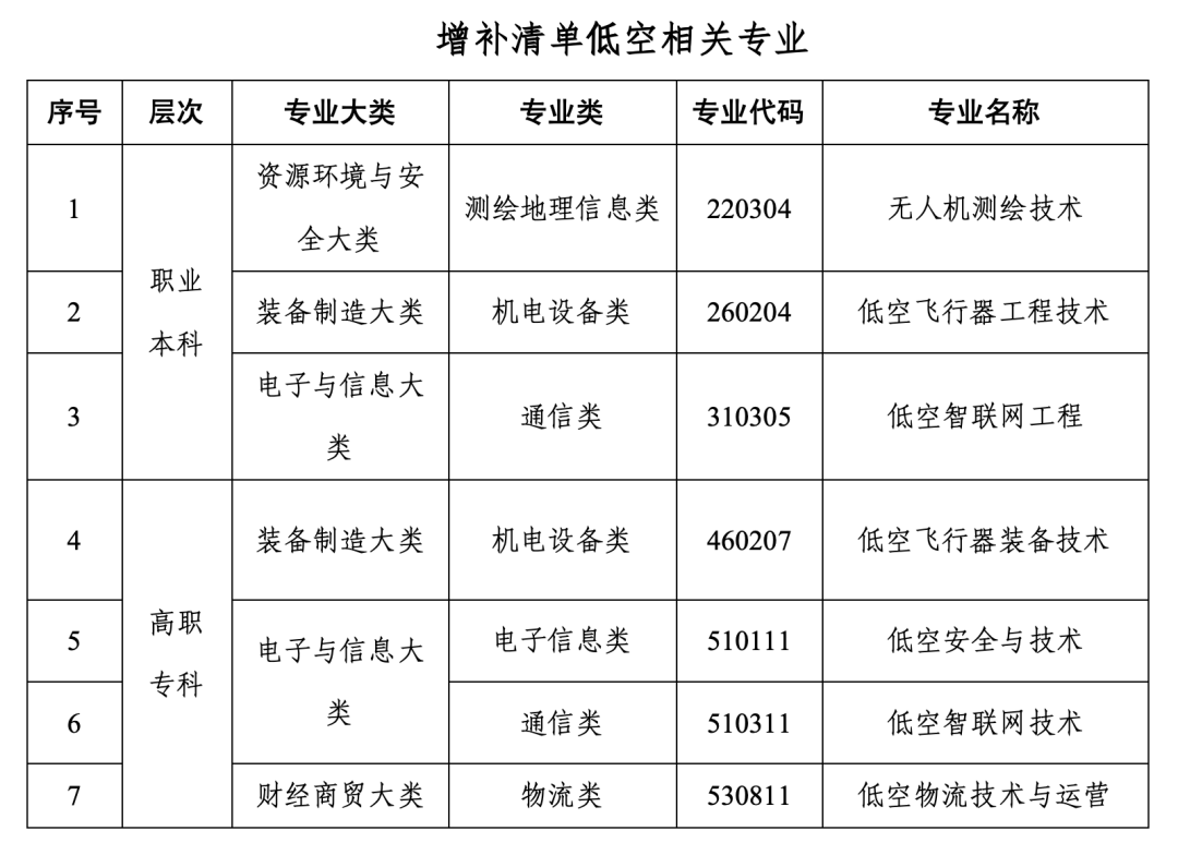 其中,7個(gè)低空相關(guān)專業(yè)獲批,包括3個(gè)職業(yè)本科專業(yè)(無人機(jī)測(cè)繪技術(shù)、低空飛行器工程技術(shù)、低空智聯(lián)網(wǎng)工程)和4個(gè)高職??茖I(yè)(低空飛行器裝備技術(shù)、低空安全與技術(shù)、低空智聯(lián)網(wǎng)技術(shù)、低空物流技術(shù)與運(yùn)營(yíng)),覆蓋資源環(huán)境與安全、裝備制造、電子與信息和財(cái)經(jīng)商貿(mào)4大專業(yè)類別,標(biāo)志著我國(guó)低空經(jīng)濟(jì)人才培養(yǎng)體系正在快速成型。