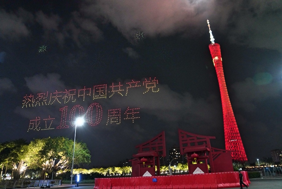 無人機展示“熱烈慶祝中國共產(chǎn)黨成立100周年”的宣傳標語口號。