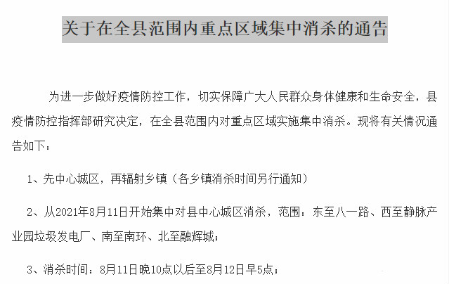無(wú)人機(jī)高空噴灑集中消殺按先中心城區(qū)再輻射鄉(xiāng)鎮(zhèn)(各鄉(xiāng)鎮(zhèn)消殺時(shí)間另行通知)順序進(jìn)行,從8月11日晚10點(diǎn)以后至8月12日早5點(diǎn)集中對(duì)縣中心城區(qū)消殺,具體范圍:東至八一路、西至靜脈產(chǎn)業(yè)園垃圾發(fā)電廠、南至南環(huán)、北至融輝城。