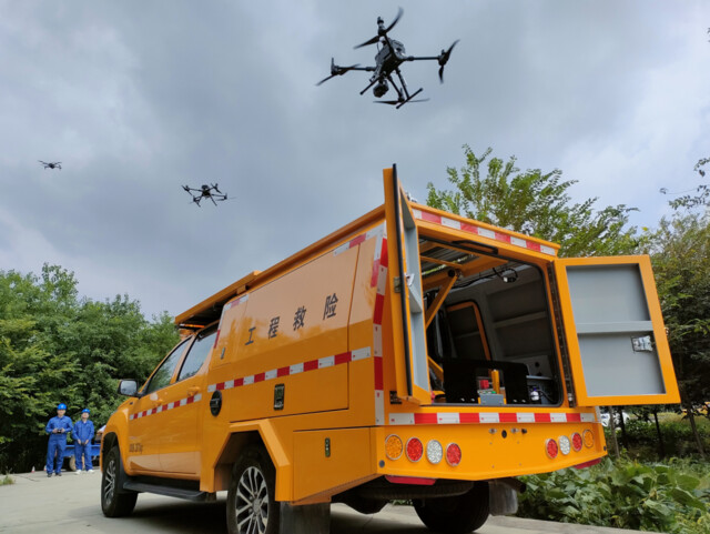 走近移動“機巢”,記者發(fā)現(xiàn)該“機巢”由一輛工程搶修車改裝而成,在車后斗的移動平臺中,有電源、自動控件、滑軌、起降平臺、通訊模塊等部件,無人機不使用時便收納在“機巢”中,一旦接收到工作指令,起降平臺將自動升上車頂,無人機自動離巢起飛執(zhí)行任務(wù)。