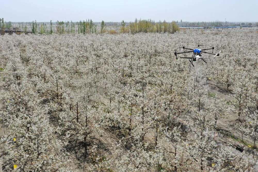 梨花授粉有了新“神器”。在庫爾勒香梨的產(chǎn)地巴音郭楞蒙古自治州,往年梨花主要靠人工或者蜜蜂授粉?,F(xiàn)在,無人機成功替代蜜蜂執(zhí)行高效液體授粉作業(yè)。這項技術(shù)將使梨農(nóng)從繁重的授粉工作中解脫出來,提高了生產(chǎn)效率。