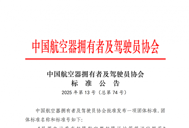 中國航空器擁有者及駕駛員協(xié)會批準(zhǔn)發(fā)布一項(xiàng)團(tuán)體標(biāo)準(zhǔn)。團(tuán)體標(biāo)準(zhǔn)名稱和標(biāo)準(zhǔn)號如下:《民用電動垂直起降航空器起降場地等級評定規(guī)范》(T/AOPA0088—2025)以上標(biāo)準(zhǔn)于2025年08月20日起實(shí)施。予以公告。中國航空器擁有者 ...